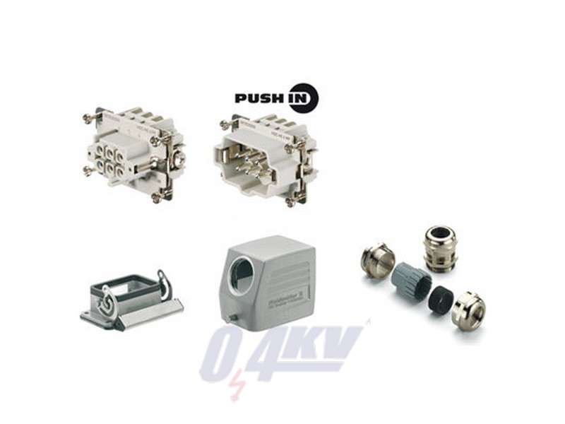 Industry plug-in connector set consisting of insert, enclosure and cable gland.