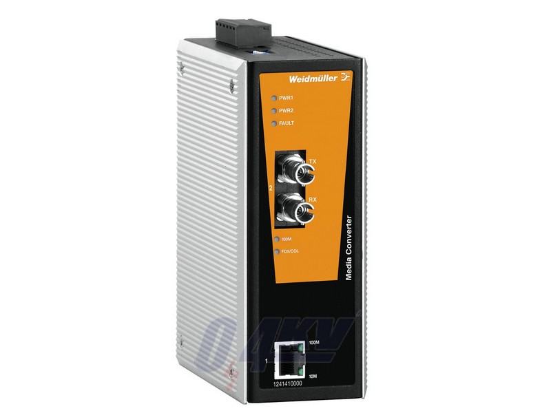 Media converter for implementing Ethernet via an RJ45 interface with fibre-optic cables.