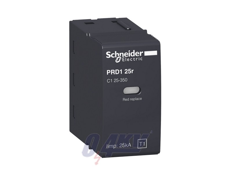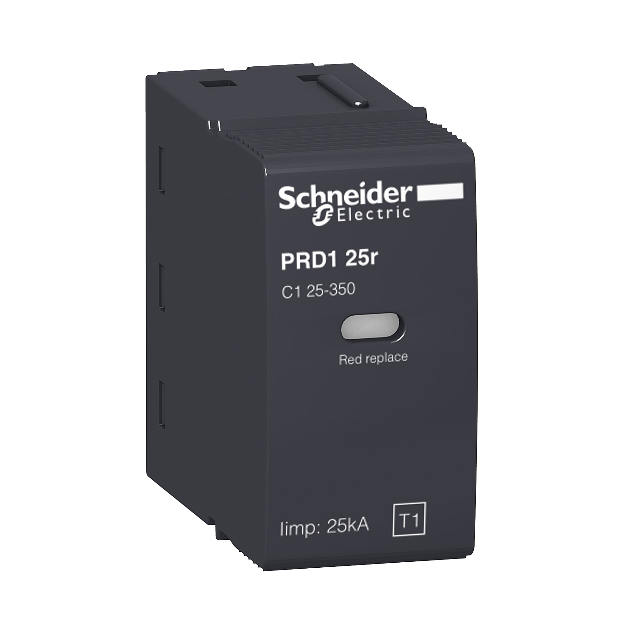 This Acti9 product is a cartridge C1 25-350 for surge arrester PRD1. This product is compatible with TT and TN earthing system. The Uc maximum continuous operating voltage is 350VAC. The Up Voltage protection level is 1.5kV. It can be plugged into a surge protecting device module. Its width is pitches of 9mm. The product color is anthracite grey (RAL7016). The dimensions are (W) 23mm x (H) 50mm x (D) 57mm. According to IEC 60529 standard, the degree of protection is IP20 or IP40 in modular enclosure. The operating temperature is -25°C to 60°C. The storage temperature is -40°C to 80°C. It is compliant with IEC 61643-1 and EN 61643-11 standards.
