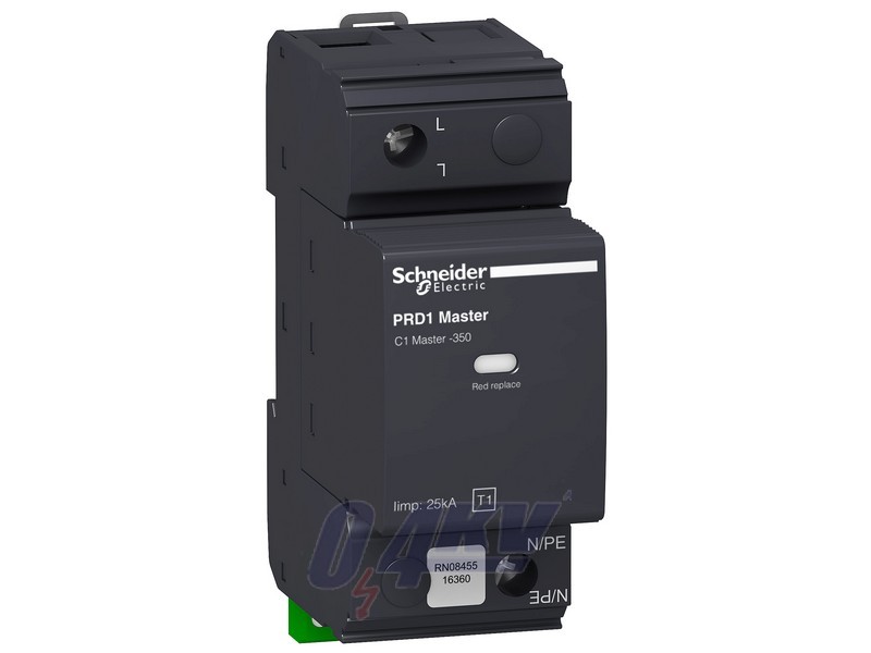 This Acti9 PRD1 is a modular surge arrester protecting 1P electrical installations against direct lightning strikes. The In nominal discharge current is 25kA. The Type 1 surge arrester is recommended for electrical installations in the service sector and industrial buildings protected by a lightning conductor. It is used to conduct the direct lightning current, propagating from the earth conductor to the network conductors. The surge arresters with r indication have remote transfer of the information Cartridge to be replaced. The Uc maximum continuous operating voltage in DM common mode (between phase and earth) is 350VAC. The Up Voltage protection level in CM common mode (between phase and earth) is 1.5kV. The Ue rated operational voltage is 230VAC +/- 10%. The product colour is anthracite grey (RAL7016).The dimensions are (W) 35.8mm x (H) 90mm x (D) 70mm. The weight is 0.303kg. The degree of protection is IP20 and IP40 in modular enclosure. The operating temperature is -25°C to 60°C. The storage temperature is -40°C to 80°C. This product is compliant with EN 61643-11 and IEC 61643-11 standard.