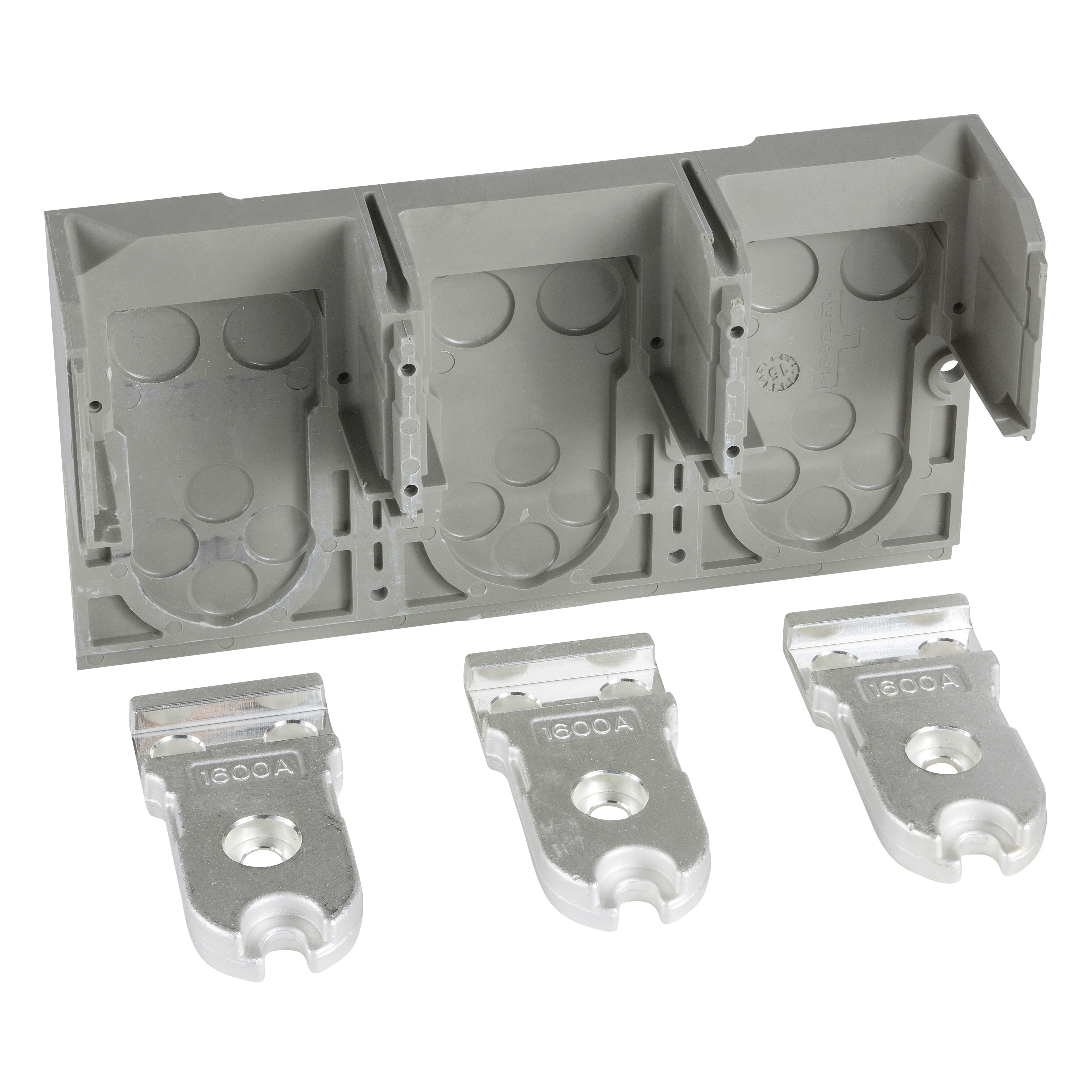 These accessories are front connections for 3 poles fixed Compact NS circuit breakers and fixed Compact NS switch disconnectors. They can be adapted to Compact NS 630b/800/1000 circuit breakers with N/H breaking capacity codes. They can be adapted also to Compact NS 630b/800/1000 NA switch disconnectors. These front connections terminals are designed for bottom mounting. They are equipped with M10 captive screws for direct connection of bars. Bare cable and cable with lugs can be adapted using some accessories. The pitch is 70mm and the terminal width is 44mm. They are sold by set of 3 parts.
