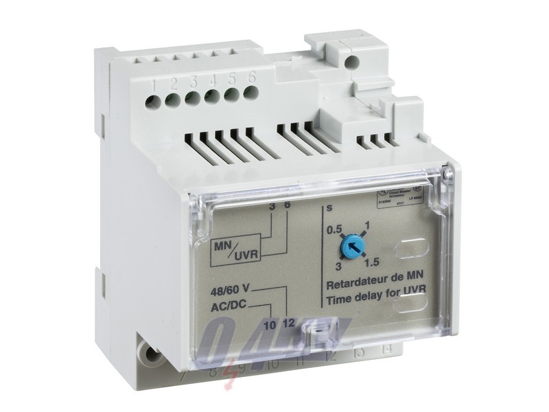This time delay unit is an auxiliary that can be combined with an undervoltage release (MN). It must be associated with a 48VDC MN undervoltage release. It eliminates the risk of nuisance tripping due to transient voltage dips lasting from 200ms to 3s. Its power supply is 48-60VDC or 48-60VAC 50/60Hz. This time delay unit has 4 adjustable steps (0.5s - 1s - 1.5s - 3s). It is an external accessory and can be mounted in the switchboard.