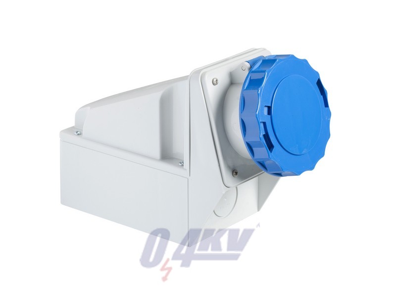 This Pratika industrial socket with completely loosened captive screws connection is wall mounted. It has 2P+E poles, rated current is 63A and the operating voltage is 200VAC to 250VAC. The dimensions of the base plate are (W) 104mm x (H) 255mm. The degree of protection is IP67 and IK08. The fire resistance is 850°C. The cable entries are for flexible or rigid cables. The size of the cable entries in 63A is 17mm to 31mm for 6mm² to 25mm² cables. The color of the socket is light grey (RAL 7035) with blue easy identification of the operating voltage. The frequency is 50Hz or 60Hz. The clock position of contact is 6h.
