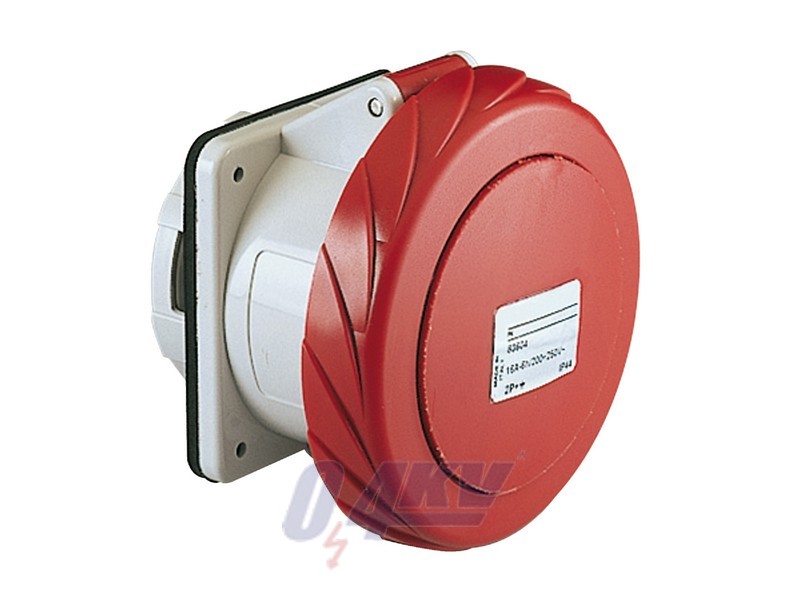 This Pratika industrial socket with completely loosened captive screws connection is straight panel mounted. It has 3P+E poles, rated current is 63A and the operating voltage is 400VAC. The dimensions of the base plate are (W) 108mm x (H) 107mm. The degree of protection is IP67 and IK08. The fire resistance is 850°C. The cable entries are for flexible or rigid cables. The size of the cable entries in 63A is 17mm to 31mm for 6mm² to 25mm² cables. The color of the socket is light grey (RAL 7035) with red easy identification of the operating voltage. The frequency is 50Hz or 60Hz. The clock position of contact is 6h.