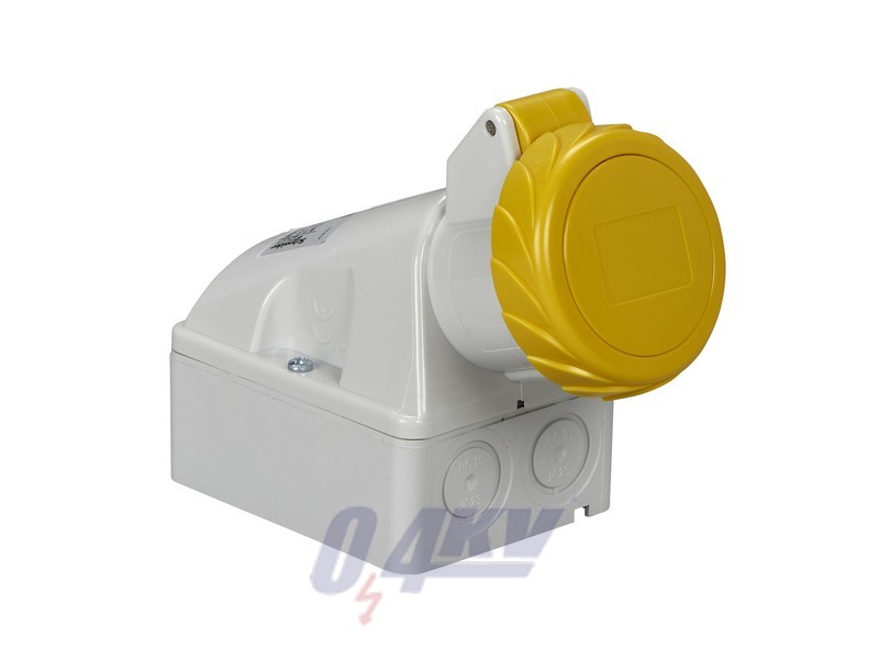 This Pratika industrial socket with completely loosened captive screws connection is wall mounted. It has 2P+E poles, rated current is 16A and the operating voltage is 110VAC. The dimensions of the base plate are (W) 80mm x (H) 155mm. The degree of protection is IP67 and IK08. The fire resistance is 850°C. The cable entries are for flexible or rigid cables. The size of the cable entries in 16A is 8mm to 15mm for 1mm² to 4mm² cables. The color of the socket is light grey (RAL 7035) with yellow easy identification of the operating voltage. The frequency is 50Hz or 60Hz. The clock position of contact is 4h.