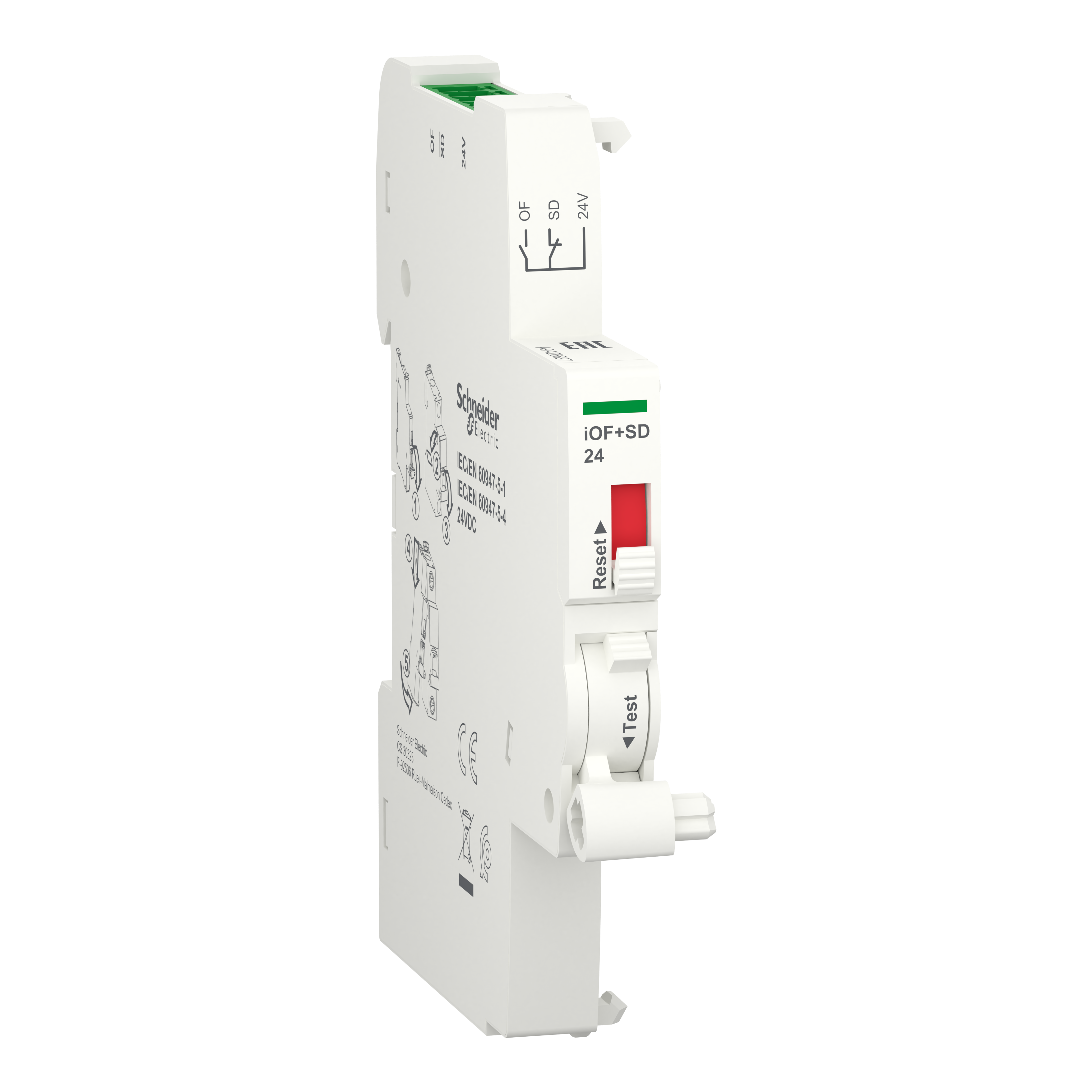 This Acti 9 iOF+SD24 electrical auxiliary is a double open/close and fault indicating contact. It is dedicated to iC60, iC40, iCV40, iID, iID40, iDPN Vigi, iSW-NA, iC60 & iID double terminals. The 2 contacts 1 NO + 1NC can report the signalling information of the associated device to the Acti 9 Smartlink. It reports also the electrical fault, actuation of the tripping auxiliary, Open or Closed position of the associated device informations to a programmable logic controller. The width in 9mm pitches is 1. It is compatible with downstream com busbar. Remote indication of position and tripping upon a fault of the associated device. The In rated operational current is from 2mA (mini) up to 100mA (maxi) depending on the rated voltage. The Ue rated operational voltage is 240VDC. The operating temperature is -25°C to + 70°C. The storage temperature is -40°C to + 85°C. This product complies with IEC/EN 60947-5-1 standards.