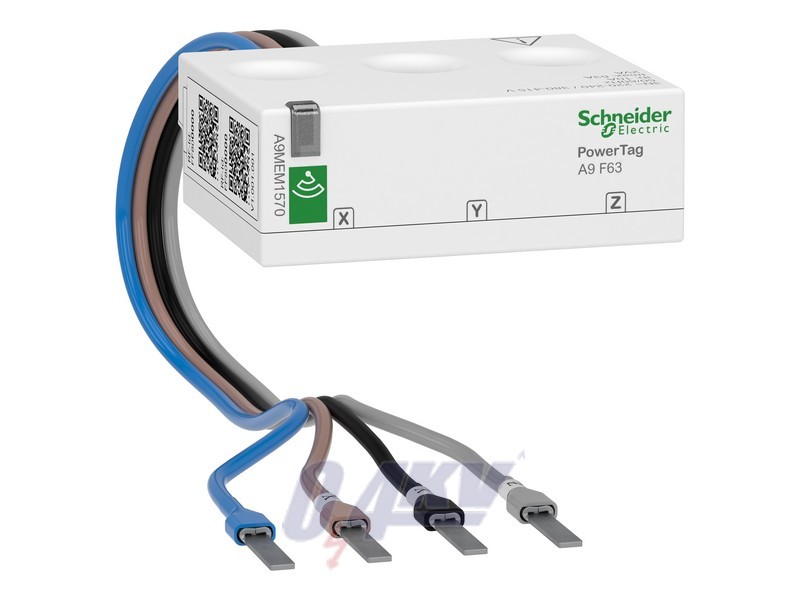 This PowerTag A9 F63 3PN for Acti 9 and Multi 9 Monoconnect offers is a Class 1 wireless-communication energy sensor. It is designed specifically for Energy Management, Load Monitoring and Power Availability applications. It incorporates accurate real-time measurements of active energy, active power, current, power factor and voltage. It has to be associated with a concentror PowerTag Link or SmartLink SI to provide circuit monitoring and diagnosis down to load level. It sends a voltage loss alarm and the current-per-phase value before being de-energized. It is dedicated to 3P+N devices with 18mm pitch between phase and neutral, rating less than or equal 63A. It can be either mounted on the top or the bottom of the protective device. The Imax maximum current is 63A. The Ib Base current is 10A. The Saturation current is 130A and the Ist Starting current is 40mA. The Un Rated voltages are Phase-to-neutral 230VAC +/- 20% or Phase-to-phase 400VAC +/- 20%. The maximum consumption is below or equal to 2VA. The degree of protection is IP20 and IK05. The operating temperature is between -25°C to +60°C. The storage temperature is between 40°C to +85°C. The Performance category is Class 1. PowerTag Energy 63A complies with IEC 61557-12 standard.