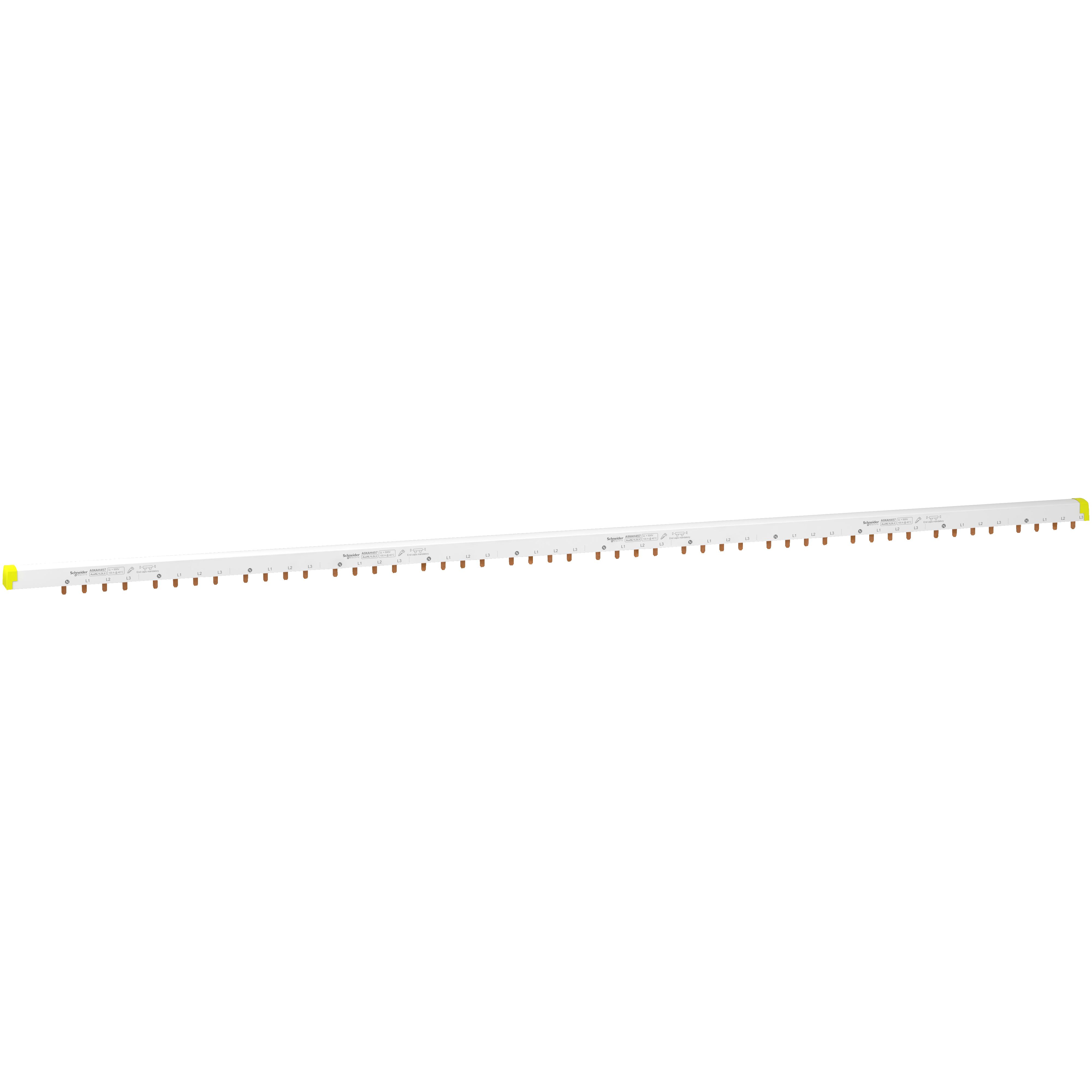 This Acti 9 horizontal comb busbar 18mm modules with 9mm auxiliary for Acti 9 C60 is cuttable. It is dedicated to Aux+3L installations. The type is AuxL1L2L3 (Auxiliary, Line). It is a set of 1 device. It is suitable for 12 devices (3P) with associated auxiliaries. The length is 1000mm. The total number of modules of 18mm is 57. The pin cross section is 16mm2. The type of electric connection is PIN. The number of phase is 3. The number of poles is 4. The Ie rated operational current at 40°C is 100A. The Isc short circuit current is compatible with the breaking capacity of Schneider Electric circuit breakers. The Ui rated insulation voltage is 500VAC. The Ue rated operational voltage is 415VAC. The color of the device is anthracite grey RAL7016. The pollution degree is 3. According to IEC 60695-2-1 standard the fire resistance is self-extinguishing at 960°C within 30s. It complies with IEC 60947-7-1 and IEC 61439-2 standards.