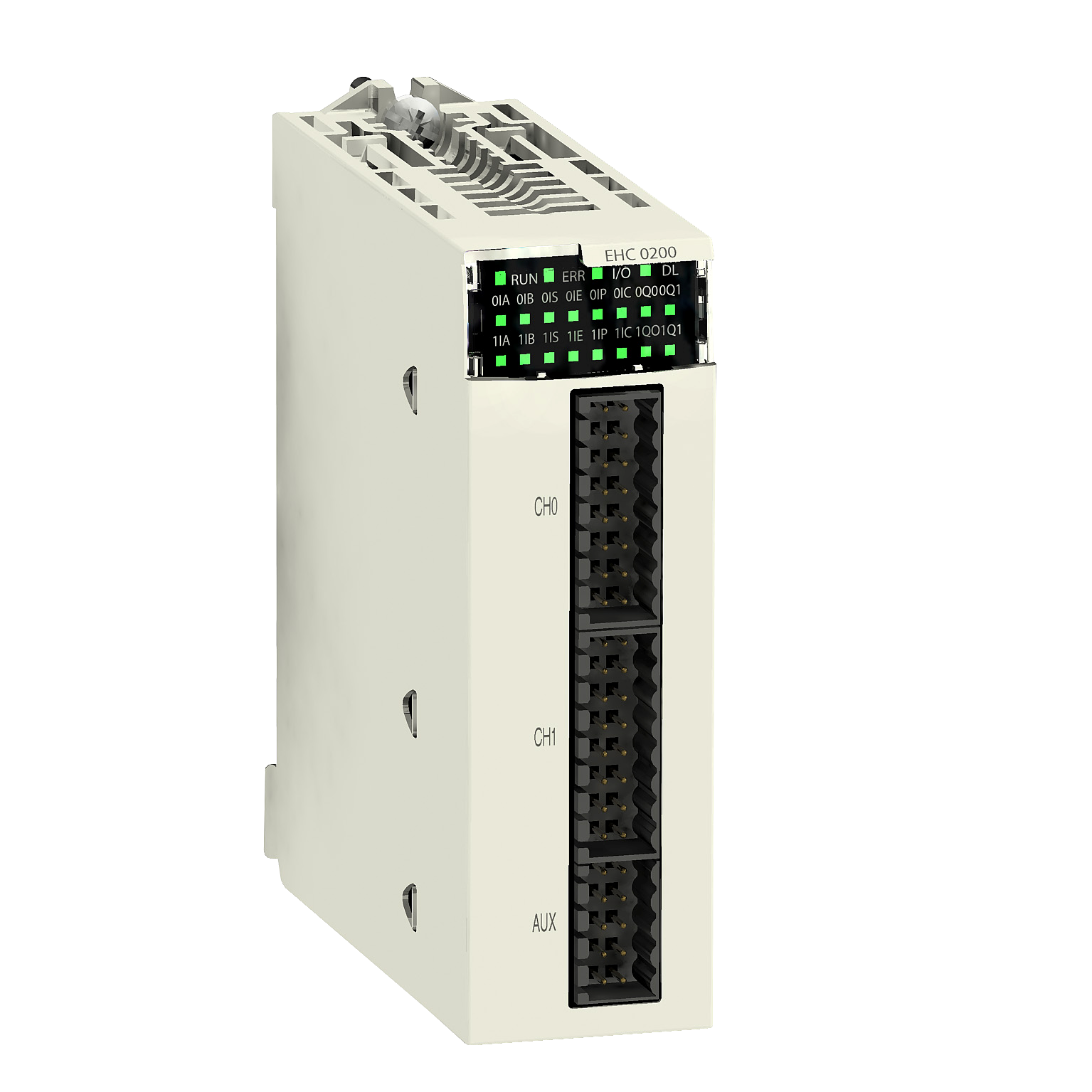 This product is part of the Modicon X80 range, a common platform of modules for Modicon M580 and M340 Programmable Automation Controllers (PAC). This high speed counter module has 2 channels, 6 inputs and 2 outputs. It is a counter module with an I/O voltage of 24V DC and a current consumption of 100mA at 3.3V DC bus, 40mA at 24V DC rack, 80mA at 24V DC sensor. Counter functions are loop (modulo) counting, width modulation, down counting etc. This product is robust, high quality and based on the latest innovative technology. It is furnished with 10-pin connector with for wiring auxiliary input and sensor power supply, 16-pin connector for wiring the sensors of counter 0 and 16-pin connector for wiring the sensors of counter 1. It is an IP20 rated product. It weighs 0.112kg. It is suitable for medium to large process applications. It meets EN 61131-2, EN 61000-6-4, EN 61000-6-2 and EN 61010-2-201 standards. This input compatible with 19.2V to 30V 2-wire/3-wire proximity sensor, incremental encoder with push-pull outputs, 10V to 30V totem pole. Modicon X80 consists in a compatible modules common platform that reduce maintenance and training costs with same spare parts in stock, and unique training for different Programmable Automation Controllers (PAC).