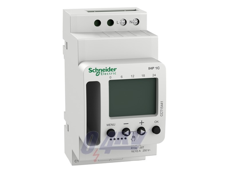 IHP digital time switch Width of 45mm (5 modules of 9mm) Automatically switches On and Off loads according to the program entered by the user on weekly level Swiching cycle is 7 days (weekly) Number of switching operations: 56 Savings on mains cut off with battery reserve: 10 years Manual override is possible 1 channel output User manual holder on product left side allows to reach document easily