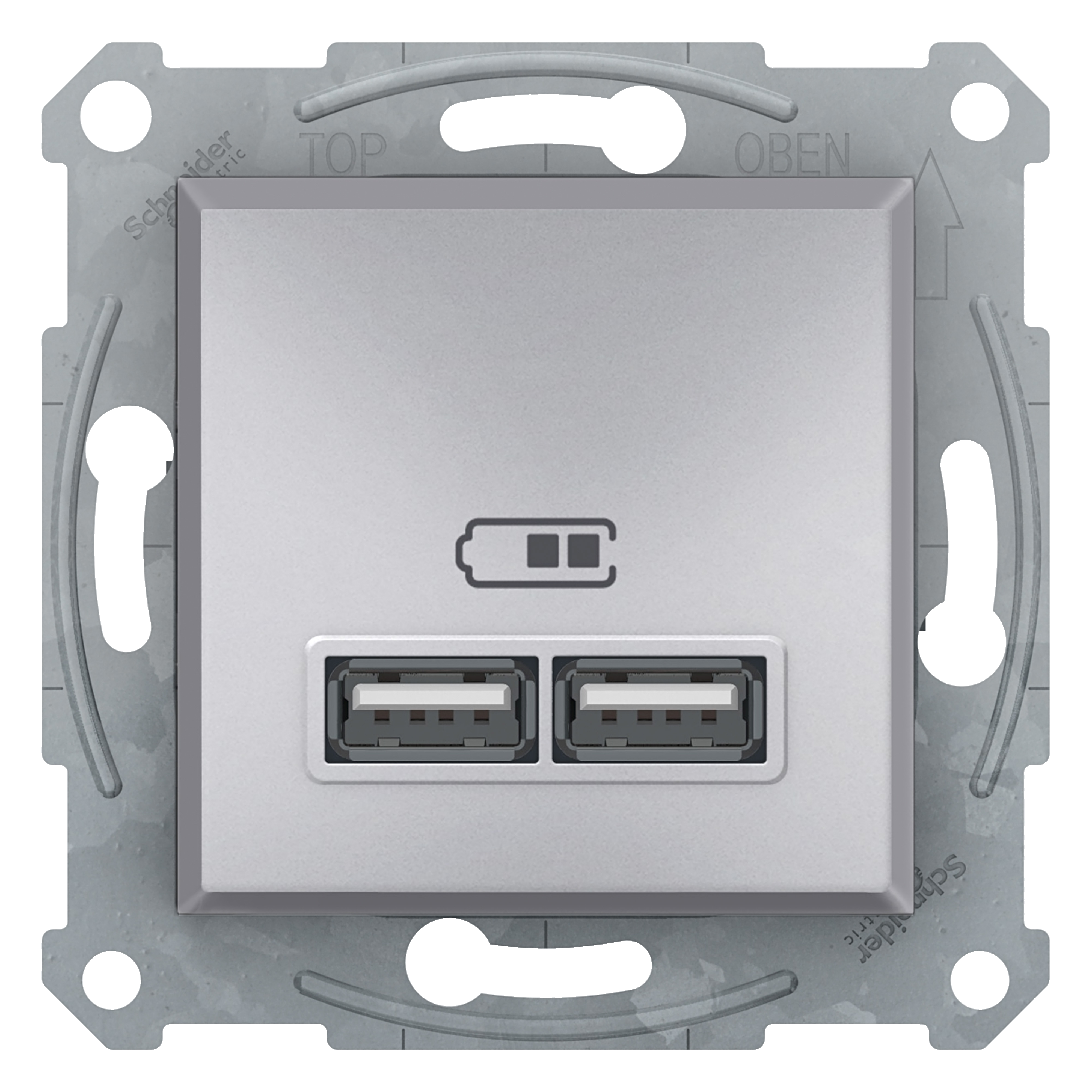 Schneider Electric Asfora USB charger EPH2700261 in color aluminium is a mechanism with fixing frame with 2 terminals. This USB charger is with USB 2.0 port, making your daily charge for mobile/tablet as convenient as possible. Its power consumption is 0.1W. 100...240V is the rated operational voltage. The input power of this USB charger is 12W. And the nominal output power of this USB charger is 10.5W, whose output current is 2.1A. The protection type of this USB charger is short-circuit protection, improving safety level. Its fixing mode is by claws, by screws. 22.5 mm, 45 mm, 42 mm is the dimension of this USB charger, whose embedding depth is 30.8 mm. Flush mounting is supported so that its box can be recessed into the surface and unexposed. This USB charger is very robust, with 30000 hours of service life. With electrical insulation class II, this device can effectively prevent electric shocks and equipment damage. Besides, it reaches IK04 protection level, protecting against 0.5 joules of impact, the equivalent to the impact of a 0.25kg mass dropped from 200mm above the impacted surface. It reaches IP20 degree of protection too. What's more, it's directives are 2002/95/EC - Ro. HS directive, 2002/96/EC - WEEE directive, 2004/108/EC - electromagnetic compatibility, 2006/95/EC - low voltage directive. The USB charger is made of ABS (acrylonitrile butadiene-styrene), PC (polycarbonate) GF10 FR, making it as resistant as possible. Also, being environment-friendly, this device reached Regulation (EC) No 1907/2006. The device satisfies the standard of EN 60950-1, EN 62684, ETSI EN 301 489-4 too. It obtained EAC certificates as well. Asfora products are made from high-quality materials that won't yellow over time. The sleek, elegant design harmonizes perfectly with virtually any interior.