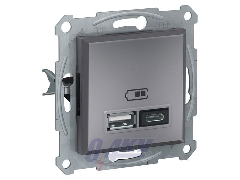 Schneider Electric Asfora USB charger EPH2700362 in color steel is a mechanism with fixing frame with 2 terminals. With USB 2.0 port, making your daily charge for mobile/tablet as convenient as possible. Its power consumption is 0.075W. In addition, the rated operational voltage of this device is 100...240V. The input power of this USB charger is 12W. And the nominal output power of this USB charger is 12W, whose output current is 2.4A. With short-circuit protection type, this USB charger concerns your safety. The device's fixing mode is by claws, by screws. 22.5 mm, 45 mm, 42 mm is the dimension of this USB charger, with a embedding depth of 30.8 mm. Flush mounting is supported so that its box can be recessed into the surface. The service life of this USB charger is 30000 hours, which makes it as reliable as possible. Its electrical insulation class reaches class II, which helps guard you against electric shocks and avoids equipment damage from accidental discharges. Besides, it reaches IK04 protection level, protecting against 0.5 joules of impact, the equivalent to the impact of a 0.25kg mass dropped from 200mm above the impacted surface. And it reaches IP20 degree of protection too. What's more, it's directives are 2002/95/EC - Ro. HS directive, 2002/96/EC - WEEE directive, 2004/108/EC - electromagnetic compatibility, 2006/95/EC - low voltage directive. Being made of ABS (acrylonitrile butadiene-styrene), PC (polycarbonate) GF10 FR material, this USB charger is very reliable and resistant. Also, being environment-friendly, this device reached Regulation (EC) No 1907/2006. Besides, the standard of EN 60950-1, EN 62684, ETSI EN 301 489-4 is well met. It obtained EAC certificates as well. Asfora products are made from high-quality materials that won't yellow over time. The sleek, elegant design harmonizes perfectly with virtually any interior.