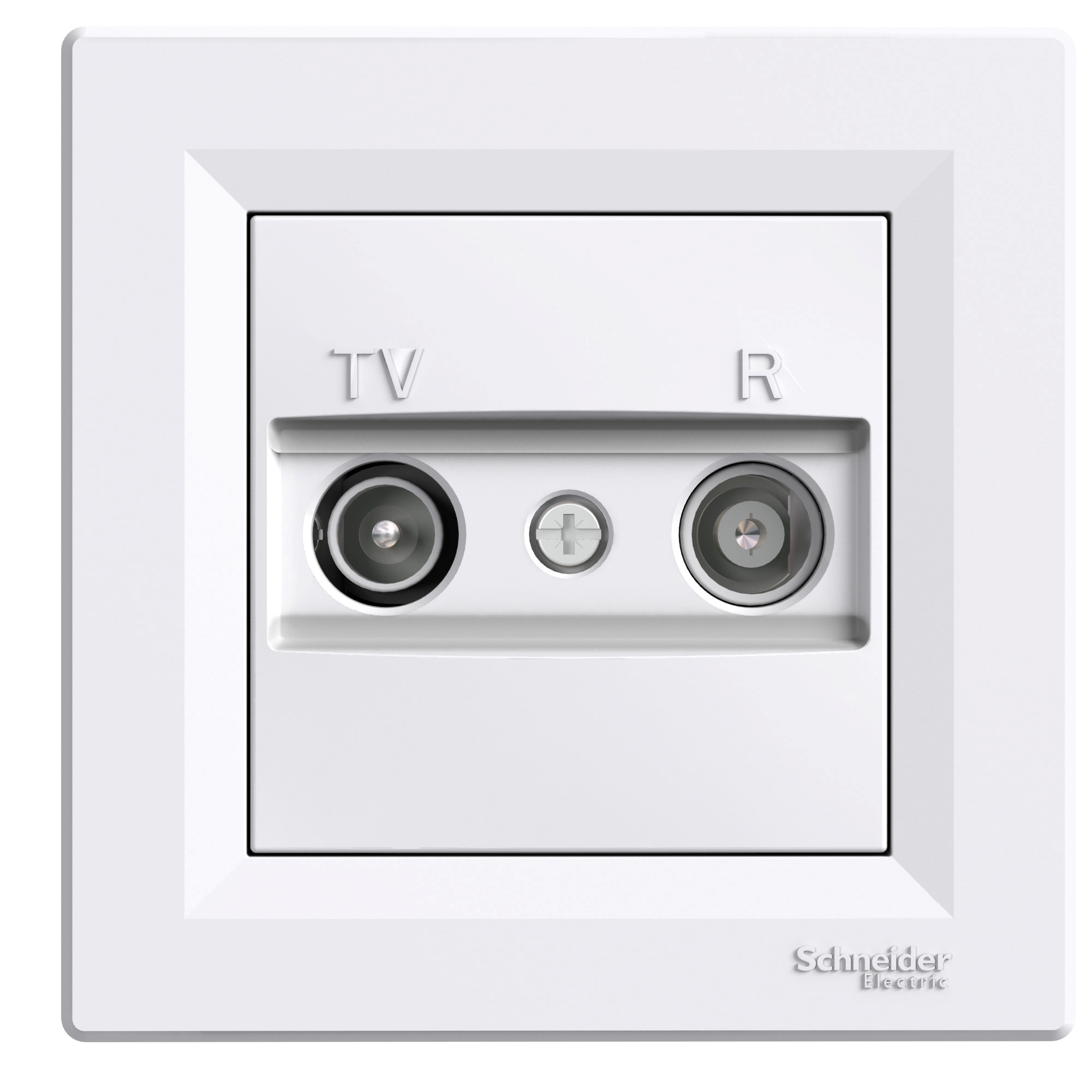 Schneider Electric Asfora TV/R socket EPH3300121 in color white is a complete product with 2 outlets. And the FM connector is female IEC 9.52 mm. The TV socket type is end-of-line (terminal socket), and the TV connector is male IEC 9.52 mm. The fixing mode of this device is claws. 83 mm, 83 mm and 38 mm are the width, height and depth respectively, and its projecting depth is 10 mm. This TV/R socket enables flush mounting, making its box not protruding the wall. The surface finish is glossy, delivering a luxurious feel to a room. Its connection terminals are screwless terminals. And it reaches IP20 degree of protection too. The TV/R socket is made of ABS (acrylonitrile butadiene-styrene), making it as resistant as possible. The conductor material of copper makes it more reliable. Also, it has the quality label of CE. As a green premium product, this device is environmentally friendly as well. And it is mercury free, taking care of the environment and your health all the time. In addition, this TV/R socket is specially designed for residential, small commercial, facilitating the daily needs easily and safely. Asfora is a range of wiring devices including light switches, dimmers, power and communication sockets, and controllers for blinds. The sleek, elegant design harmonizes perfectly with virtually any interior. As pleasing to the touch as they are to the eye, Asfora products are made from high-quality materials that won't yellow over time.