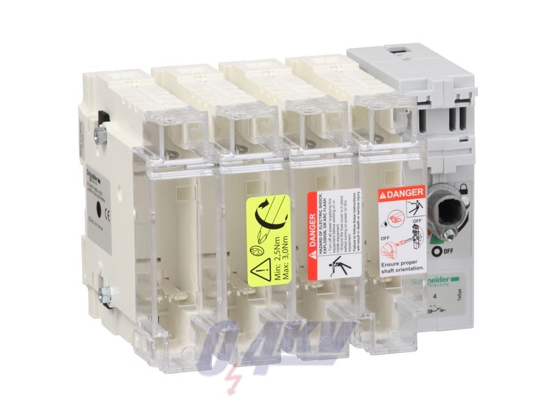 TeSys GS fuse switch-disconnector, 4 poles (4P), 100A/750V, to be used with NFC cylindrical fuse links size 22x58mm up to 100A, for motor applications up to 51kW@400V AC-23. To be equipped with an external front side or right-hand side mounting operating handle GS2AH (several models available). Screw terminals to be equipped with upstream and downstream 4P terminal shrouds GS1AP34 (to be ordered separately), it provides high short circuit current rating 100kA@400V. Add-on auxiliary contact modules GS1AM (front mounting), GS1AN (side mounting), GS1AF (top mounting for blown signaling with stricker fuses) can complete the assembly (to be ordered separately). Type aM and gG 22x58mm cylindrical fuse links without strickers DF2FA, DF2FN and with strickers DF3FA, DF3N are available (to be ordered separately). Multi standards certified (IEC, Marine), Green Premium compliant (RoHS/REACh).