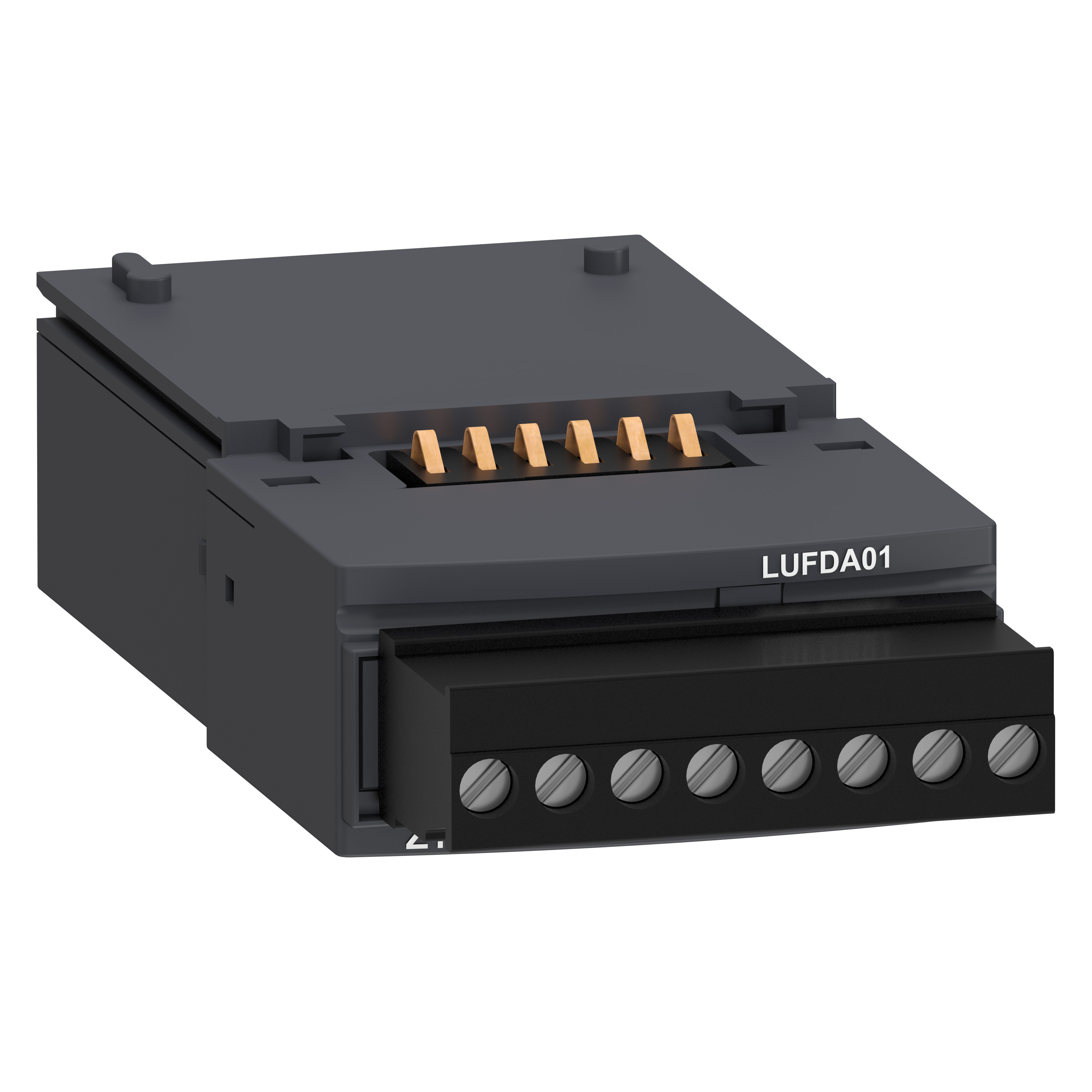 TeSys U additional function module to be inserted in advanced power bases LUB120, LUB320, LUB380 for thermal overload tripping indication. It indicates the overload tripping and reset done by the power base control pad or done remotely. It provides 1NC instantaneous contact rated 24-250V AC/DC 5A max. It requires an external power supply 24-240V AC or DC. To be inserted in the cavity of a power base provided for the auxiliary modules. Certified when used in conjunction with a LUB power base (IEC, UL, CSA, CCC, EAC, Marine), Green Premium compliant (RoHS/REACh).