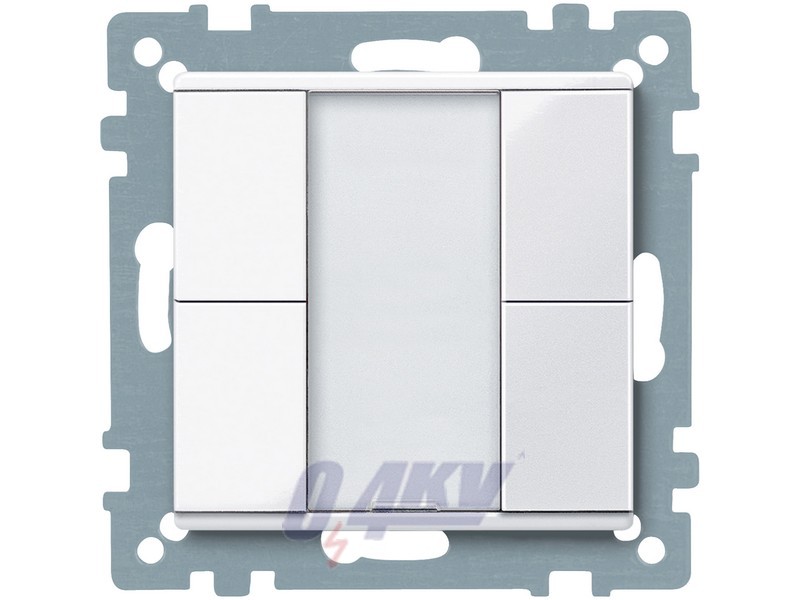 KNX Push-button, 2-gang plus. For System M. With integrated bus coupling unit. Push-button with 4 operating buttons, operating and status display and labelling field. The operating display can also be used as an orientation light. The device is connected to the bus line with a bus connecting terminal. KNX software functions: Switching, toggling, dimming (single/dual-surface), blind (single/dual-surface), pulse edges trigger 1-, 2-, 4- or 8-bit telegrams. Distinction between short and long operation, pulse edges with 2-byte telegrams (distinction between short and long operation), 8-bit linear regulator. Scene retrieval, scene saving, disable functions. Contents: With protective hood for plaster. With bus connecting terminal. Material: Thermoplastic brillant, antibacterial. Colour: similar RAL 9016. Colour: active white, glossy.