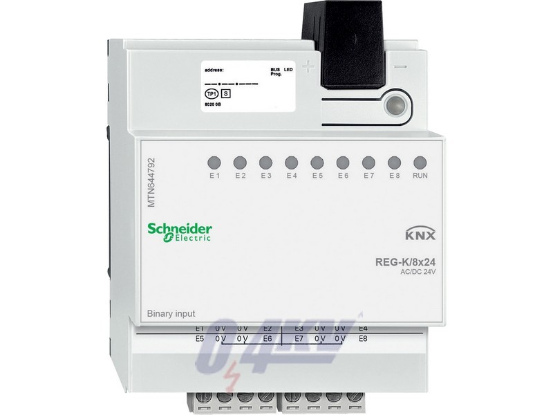 KNX Binary input REG-K/8x24. For connecting eight conventional devices withAC/DC 24 V outputs to the KNX. With integrated bus coupler and plug-in screw terminals. The input voltage level is displayed at each input with a yellow LED. A green LED indicates that the device is ready for operation once the application has been loaded. For installation on DIN rails TH35 according to EN 60715. The bus is connected using a bus connecting terminal. a data rail is not necessary. KNX software functions:. Switching, dimming or blind control via 1 or 2 inputs. Positioning values for blind control (8-bit). Pulse edges with 1-, 2-, 4-, or 8-bit telegrams. Differentiation between short/long operation. Initialisation telegram. Cyclical sending. Pulse edges with 2-byte telegrams. 8-bit linear regulator. Disable function. Break/make contact. Debounce time. Input voltage: AC / DC 24 V. Inputs: 8. Input current: DC 15 mA (30 V), AC 6 mA (27 V). 0 signal: /equal 5 V. 1 signal: /equal 11 V. Cable length: max. 100 m. Device width: 4 modules, approx. 70 mm. Contents: With bus connecting terminal and cable cover. Colour: light grey.