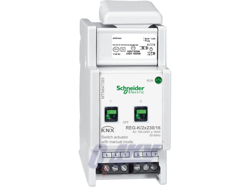 For independent switching of loads via make contacts. All 230 V switch outputs can be operated with manual switches. With integrated bus coupler. The device is connected to the mains via screw terminals. every second L connection is bridged internally. A green LED indicates readiness for operation after the application has been loaded. For installation on DIN rails TH35 according to EN 60715. The bus is connected using a bus connecting terminal. a data rail is not necessary. KNX software functions:. Operation as break or make contact, delay functions for each channel, staircase lighting function with/without manual OFF function. Cut-out warning for staircase lighting function, blocking and additional logic operation or priority control, scenes, status feedback function per channel, central function. Comprehensive parameterisation for bus voltage failure and recovery, parameterisable download behaviour. Nominal voltage: AC 100-240 V ±10%. Operating voltage: min. AC 90 V - max. AC 265 V. Mains frequency: 50-60 Hz ±10%. For each switching contact: Switching current: 16 A, cos Phi 0.6. AC1 operation: max. 16 A. AC3 operation: max. 10 A. AC5 operation: max. 16 A. DC current switching capacity: max. 16 A/ 24 V DC. Output life endurance: Mechanical: 1000000. AC1/AC3/AC5 operation: 3x10000. 230V, 1A resistive: 8x100000. Nominal load. Incandescent lamps: AC 100 V, max. 1600 W. AC 230 V, max. 3600 W. AC 240 V, max. 3840 W. Halogen lamps: AC 100 V, max. 1086 W. AC 230 V, max. 2500 W. AC 240 V, max. 2608 W. Fluorescent lamps: AC 100 V, max. 1086 VA. AC 230 V, max. 2500 VA. AC 240 V, max. 2608 VA. parallel-compensated. Capacitive load: AC 230 V, 16 A, max. 200 µF. Minimum switching performance: 100 mA/12 V AC/DC. Maximum peak inrush-current: 150µs: 600 A. 250µs: 480 A. 600µs: 300 A. Device width: 2.5 modules, approx. 45 mm. Contents: With bus connecting terminal and cable cover. Colour: light grey. 2 channel device
