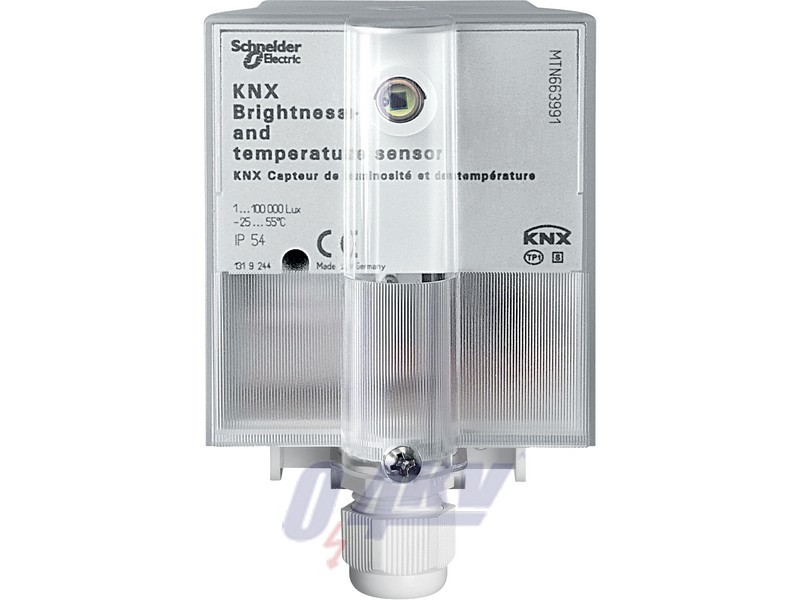 KNX brightness and temperature sensor. The sensor records brightness and temperature and transmits these values to the bus. It has a temperature sensor and a brightness sensor. 3 universal channels for single tasks or logic operations. Temperature and brightness threshold in any combination. Sun protection channel for blinds/roller shutter control. Objects for: twilight threshold, brightness threshold, drive control, automatic sun function, teaching, security. Automatic sun protection. Controls the blinds automatically during the day. Teaching object. With this, every brightness threshold can be reset by the touch of a key. Suitable for mounting on an outside wall.With integrated bus coupler. The bus is connected using a bus connecting terminal. Power consumption: max. 150 mW. Sensors: 2. Temperature measurement range: - 25 °C to + 55 °C (±5 % or ±1 degree). Brightness measurement range: 1 to 100,000 lux (±20% or ±5 lux). Type of protection: IP 54 according to DIN EN 60529 for vertical installation with cover. Dimensions: 110 x 72 x 54 mm. Colour: light grey.