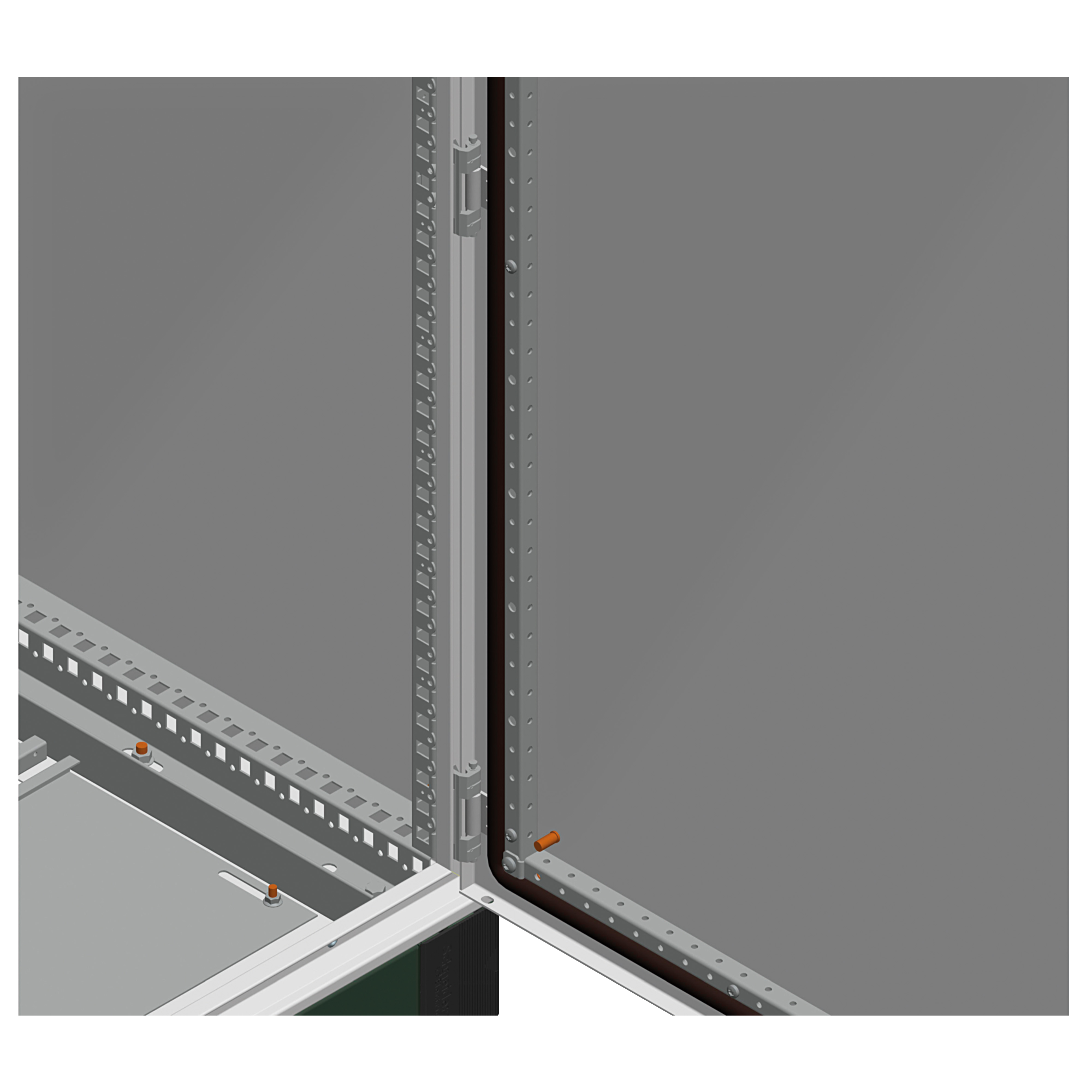 Spacial SM vertical adaptation profiles. 1200 mm. Allows to have fixation points in the external frame of the monobloc enclosure. Fixation in the hinge and latches holes. Zinc plated steel. 2 profiles delivery.