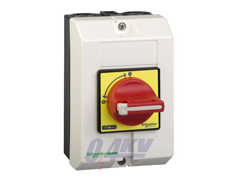 TeSys enclosed starters, empty enclosure for mounting a switch disconnector for main switching in motor applications up to 45kW@400V AC-23. Enclosure providing IP65 protection, fitted with a red rotary handle and yellow front plate, padlockable (padlocks not included). to be equipped with a Vario switch body V5-V6 (to be ordered separately), with 1 possible add-on module attachments Surface mounting enclosure with screw fixing, 2 knock-outs for cable glands on top and bottom, sealable cover. It conforms to IEC 60947-4-1, Green Premium compliant (RoHS/REACh).