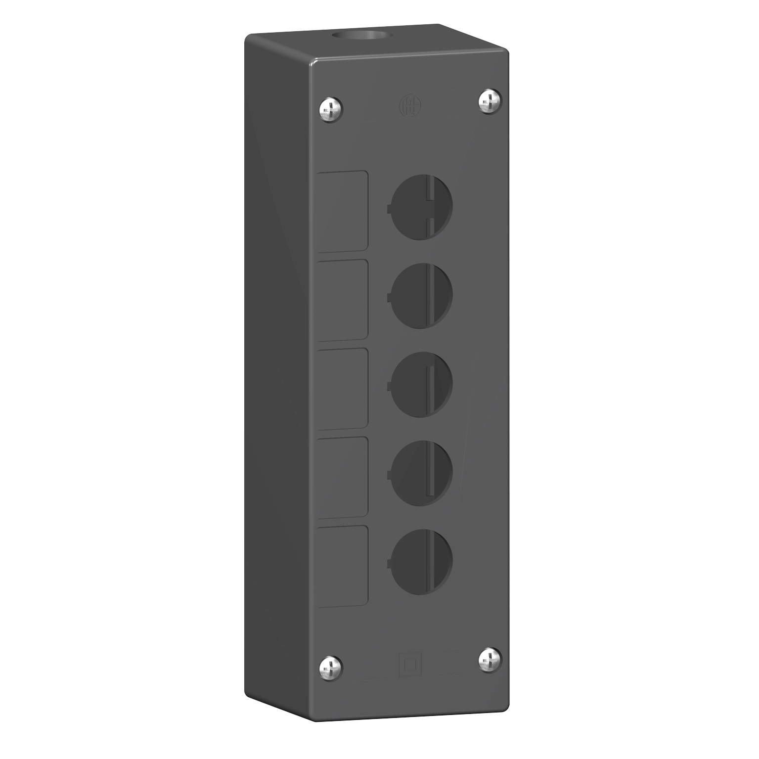 This Harmony XALG, is an empty control station for severe environments. It has 5 cut-outs, 5 vertical openings, diameter 22mm for 5 functions. It is impact resistant, dust resistant, water resistant and vibration resistant thanks to its IP66, IP67, IP69, IP69K, making it ideal for operation in harsh environments. Extremely robust, this control station ensures esistance to high pressure cleaning and resistance to chemical products. Its wide range of operating temperatures from -25°C to 70°C allows versatility in usage of product. It provides mineral a reinforced polyamide enclosure with a black (RAL 9005) base of enclosure and a black (RAL 9005) cover. It is suited for applications like animal farming, food and beverage production/processing, water industry, cereal and fruit growing, aquaculture, shipbuilding and maintenance, and building construction, waste and wastewater treatment, etc. It is compatible with the Harmony XB5 range of control and signaling units, providing a wide choice of circular and square heads