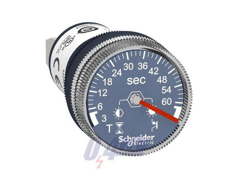 This Harmony XB5, monolithic analog timer can be set for timing intervals between 3 to 60 seconds and is supplied with a 24V DC input. This analog timer provides visual timing of your processes. It is easily installed into standard 22mm diameter cut-outs and connected with simple screw-clamp connections. It is impact resistant, dust resistant, water resistant and vibration resistant thanks to its IP65, making it ideal for operation in harsh environments. It provides highly visible timing of machine processes, ensuring accuracy and consistency of operation.